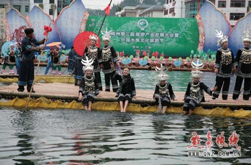 開幕式結(jié)束后,進(jìn)行了《水歌大地》大型原生態(tài)水上歌舞表演,為廣大觀眾獻(xiàn)上一臺原汁原味的水族文化大餐,展示了多姿多彩的水族文化神韻。