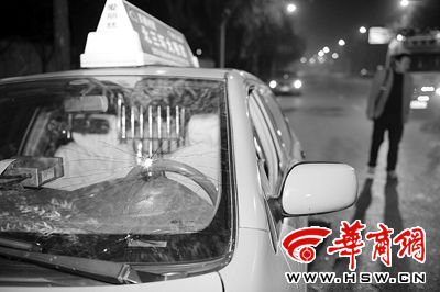 景師傅駕駛的陜AU2901牌照的綠色比亞迪出租車停在路邊,車門打開。在駕駛室門前,有景師傅脫下的血衣,滿地是擊碎的車窗玻璃,而擋風玻璃上,可清晰地看到一個彈孔。