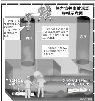 慘劇為何會(huì)發(fā)生?據(jù)救援人員初步推測,4名施工人員下井打開調(diào)壓閥門后,有大量蒸汽噴了出來,導(dǎo)致井下的氧氣不足,下井人員產(chǎn)生昏迷,同時(shí)溫度高達(dá)80℃的熱水從沒有關(guān)閉的閥門處流出,將下井人員淹在滾熱的水里。