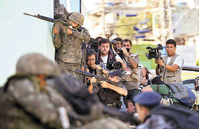 記者在巴西士兵和警方掩護下跟蹤采訪打黑行動。(路透社)