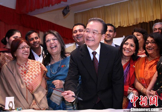 12月15日,正在印度訪問的中國總理溫家寶參觀了泰戈爾國際學校,并現(xiàn)場教印度學生書寫“中印友好”四個字。