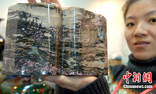 12月16日,在北京國貿舉辦的“北京首屆臺灣精致名品暨珠寶交易會”開幕,來自臺灣的136家珠寶商、工藝美術商及高檔生活用品商參展,令北京消費者大飽眼福。圖為來自臺灣花蓮的臺商展示采自花蓮玫瑰石制作的彩書。