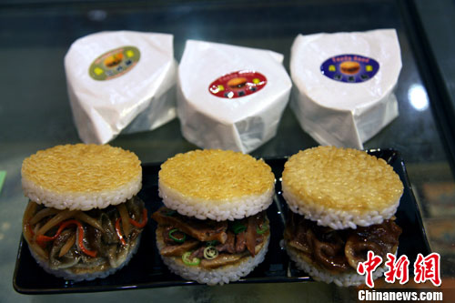 12月17日,第一屆海峽兩岸臺灣優良農產品洽商大會在臺北展覽二館開幕,主推ECFA早期收獲清單農產品及具有臺灣CAS、吉元圃、有機及農漁會百大精品等驗證標章的安全農產品。圖為展品中有頗具創意的“米漢堡”。