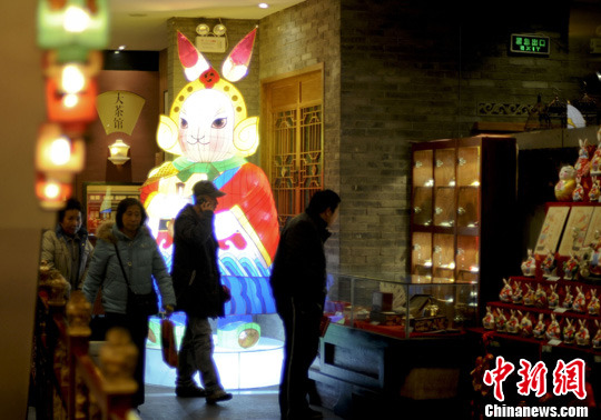 12月26日,北京老舍茶館展出巨型“兔爺”宮燈,向來茶館聽相聲的茶客恭賀新年。