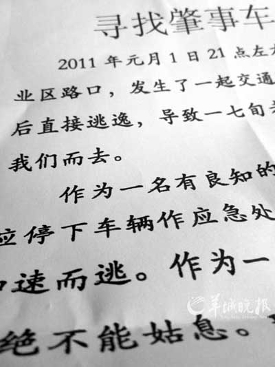 “這幾天我讓全廠的男員工放假,每人給補貼費,幫我上街派發傳單。生意我可以暫時不做,如果讓肇事司機逍遙法外,再多的錢對我也沒有意義!”朱某又稱,自己所做的事“僅限于找到肇事車輛的車牌號并提供給警方”,至于司機如何處理,“那是警方的事情”。