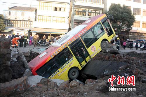 事發時,正好一輛大巴車路過,這輛龐然大物居然被彈起4米多高,后又掉入大坑中,所幸車上除一名駕駛員外無其他人員。