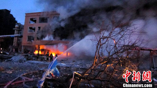 爆炸引發多棟建筑燃起大火,消防部門正在全力撲救。 蒼雁 攝
