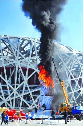 2011年1月24日中午12時,鳥巢西側一百米遠處,一處三米高正在施工的“祥云玉兔”裝飾物底部“云彩”部分起火,被工作人員發現后迅速撲滅,濃煙引來近百名游客圍觀。據悉,事因工人施工中電焊引燃塑料泡沫。 京華時報