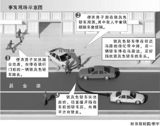 張燕說,槍響后,車內的人仍然沒有下車,銀灰色轎車突然加大馬力向前躥,撞開攔住去路的桑塔納,向西開上昌金路。據附近的黑車司機說,銀灰色轎車開走時,一只輪胎是癟的。