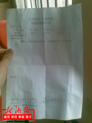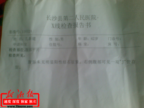 長沙縣第二人民醫院的X線檢查報告書表明,孔新建的腹部還存留一根雙J管。 新湘報記者江單攝