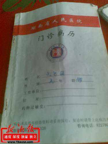 孔新建在湖南省人民醫院看病的病歷本。 新湘報記者江單攝