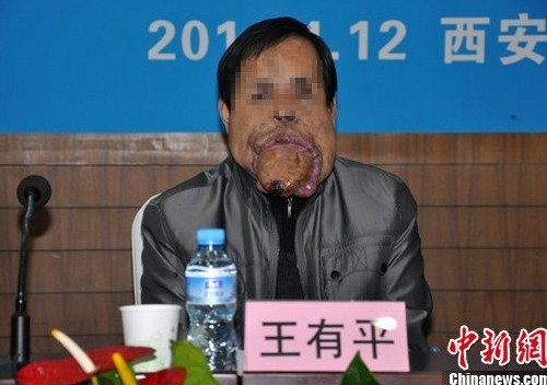 據(jù)了解,患者王有平,34歲,自出生后即被父母發(fā)現(xiàn)嘴唇發(fā)青,哭鬧時(shí)略腫大,左耳前區(qū)略隆起、發(fā)脹。6歲時(shí),患者上下嘴唇、左面部明顯腫大。從 13歲起舌體體積增大,往外伸長,直至不能像正常人那樣合嘴。由于患病,王有平口齒不清,不能正常飲食,呼吸困難,其面容經(jīng)常引起路人的歧視。2000年在北京求醫(yī)時(shí),舌頭一度出血達(dá)4000多毫升,危及生命。