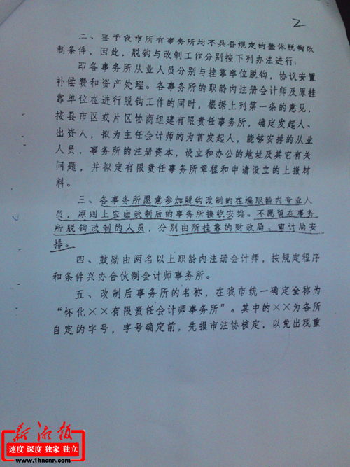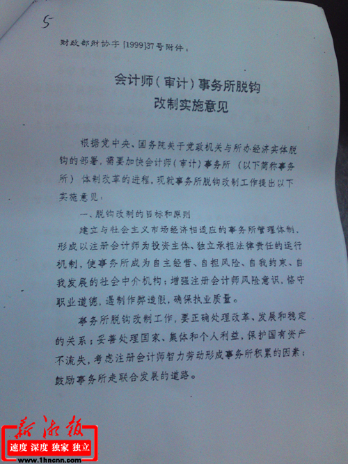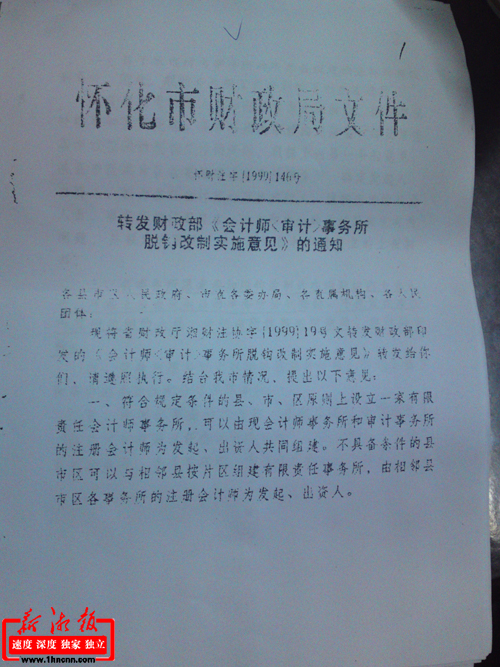 在懷化市財政局1999年146號文件轉發財政部《會計師<審計>事務所脫鉤改制實施意見》的通知中,記者看到,該通知類似姚元文人員的安排有詳細表述,該通知第三條規定,對各事務所愿意參加脫鉤改制的在編職齡內專業人員。原則上應由改制后的事務所接受安排。不愿留在事務所脫鉤改制的人員,分別由所掛靠的財政局、審計局安排。
