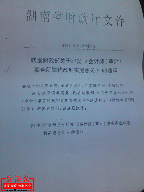 湖南省財政廳轉發財政部《會計師<審計>事務所脫鉤改制實施意見》的通知