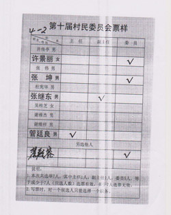 ——候選人操縱選舉全過程。按照規(guī)定,應由村民選舉委員會主持召開選舉大會,候選人不得參與選舉大會的組織工作。李姓村民告訴記者,在籌備井家溝村的換屆選舉過程中,原村書記張繼東、原村委會主任管延良早就蓄謀已久,暗地掌控選舉的組織工作。村換屆選舉的工作人員,均他們指定自己的親信擔任,對其他選舉委員會成員的意見根本不予理睬。他們拿出該村“第十屆村民委員會票樣”,記者發(fā)現(xiàn),10個候選人中,許景麗、張坤、張繼東、管廷良四個人的名字采用黑體二號字突出出來,其他6人姓名則是仿宋3號字。對于這明顯的暗示引導。