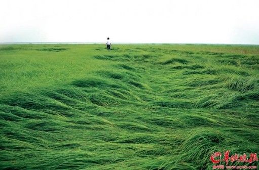 5月本是汛期,但鄱陽湖卻在這個時候失去了水,干涸的湖底,一眼望去的只有一片碧綠的湖草。當來到湖草中時,還能看到土地龜裂得一塊快,裂縫能伸進一個拳頭。在草叢中,隨處可以見到干死的魚苗和小螃蟹。成人巴掌大的蚌、密密麻麻的田螺嵌在泥里,到處都是,拿起一個田螺,撥開一看,肉厚實但已經(jīng)腐爛。