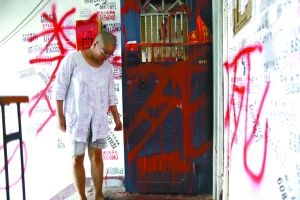 昨日,稅女士站在家門口,門外被不明人士用紅漆噴上了許多“死”字。本報記者 浦峰 攝