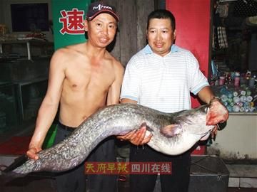 兩男子在四川龍泉湖釣起百斤鯰魚王(圖)
