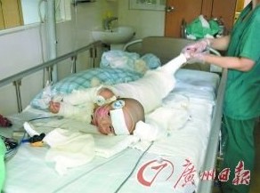 爺爺馬上把已經燙得半熟的孫子從水桶里抱出來,這時他本應用涼的自來水給小浩的身體沖洗降溫,但文化不高的他卻在慌亂中作出了錯誤的選擇——快手快腳脫下孫子的衣褲,結果大量表皮連著衣服被成片成片地撕脫了下來,早已哭得聲嘶力竭的小浩又發出一陣號叫,剝了皮的身體紅一片、黑一片,幾乎體無完膚。
