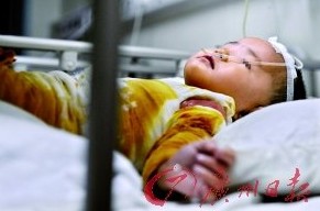 2歲的小婷婷全身包裹著,痛苦地躺在病床上。記者何波攝