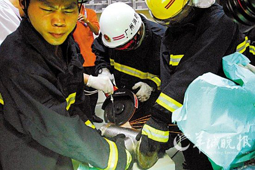 約5時,傷者在鎮靜劑和麻醉藥的作用下昏睡。搶救室內隨即響起一片“呲呲”的響聲,火花四濺,醫護人員和消防隊員開始用切割機嘗試切開絞肉機。