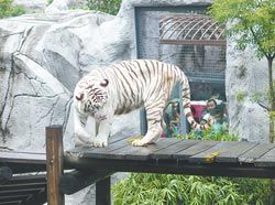 目前“昭海”體重170公斤,“歡樂”體重140公斤,與剛入園時比較,有明顯增重,由于老虎天性喜愛藏匿與戲水,動物園特別在展示場布置許多竹子與矮灌木,也有廣闊的水池讓白老虎消暑降溫。