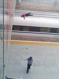 昨天青島火車站天橋上一中年男子誤把橋下要發的動車當成自己乘坐的火車縱身跳下