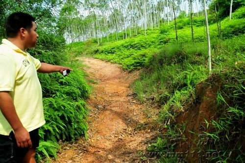 這是一條水泥硬底化的公路,從官橋鎮可通往蘭山、廉江境內及廣西等地。事發現場就在距官橋圩約4公里之處,也即官橋鎮王竹山村與豐村之間。一名村民指著公路旁邊一座只有30來米高的山嶺說,這是色魔劫持婦女至此并施行強奸的地方。在村民的帶領下,記者向上約行了30米,村民便指著路旁一棵龍眼樹下的空地說,事發現場就是這兒了。只見附近生長著不少柴草及桉樹、龍眼樹等,雖然距離公路很近,但卻難以被發現。記者向山下看去,隱約可見公路兩端各有一處村落,距離事發現場約有一里左右。