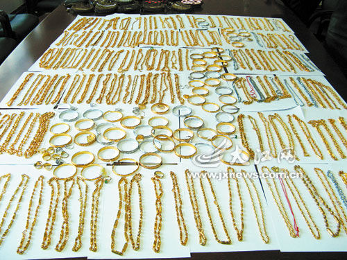 9月6日下午,記者在南昌市公安局便衣支隊二大隊看到一百多件亮晶晶的“黃金白金”首飾鋪滿一桌,還有幾十個上了鎖的小包。據辦案民警介紹,犯罪嫌疑人涂某一直喜歡賭博,負債累累。正當她為錢犯愁的時候,她想到了一個好“主意”。她找到認識十幾年的老鄰居鄧大媽,如果鄧大媽愿意定期借錢給她,她可以立刻拿等值的黃金飾品做抵押,同時還能立刻返給鄧大媽幾個點利息。鄧大媽聽說后,覺得這是好事,便與涂某達成了協議。