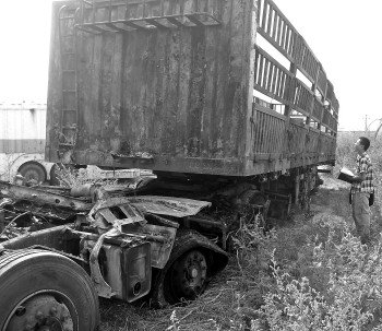 這輛滿載海綿的貨車被燒得面目全非。記者 李培樂