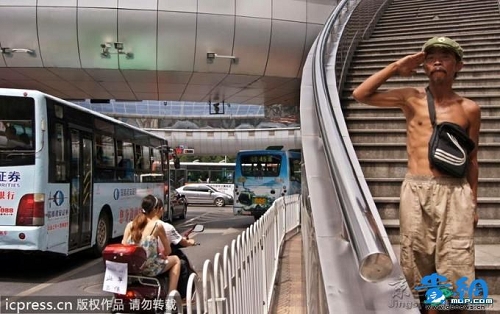 2011年9月6日,“敬禮哥”在貴陽市大十字人行天橋入口處面向過往行人畢恭畢敬的敬禮,以文明禮貌的方式向行人乞討!熬炊Y哥”家住貴陽,今年45歲,單身一人,每天靠上萬次的敬禮乞討為生。