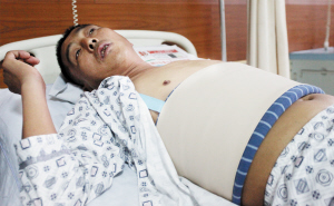 昨日,在紅橋醫院外科的觀察室內,記者見到了受傷的停車保安員劉玉剛。劉師傅說,新停車收費標準實施后,這個停車場按6元/每小時計費。前天下午2點多,兩輛黑色現代轎車相繼駛入該停車場!巴:密嚭,我告訴兩名駕駛人需要辦理‘停車專用卡’后方能繳費停車。”劉師傅說,當時,那兩輛車里有七八個人,兩名駕車男子都不愿意辦卡繳費!拔艺趧裾f駕駛人,突然一輛車內躥出4個人,其中一名男子滿嘴酒氣,他舉著一根棒球棒朝我打來,另外兩名同事見狀趕緊過來阻攔,結果也遭到毆打!迸沙鏊窬s到后才將打人者制止住,并將其帶往派出所接受問訊。事后,劉師傅被送往紅橋醫院救治,經醫生診斷,劉師傅右胸肋骨6、7、8三節肋骨骨折。
