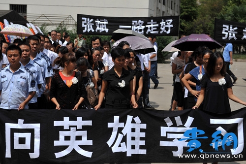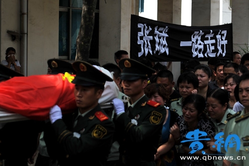 貴陽各單位和廣大市民在青山園殯儀館參加張斌的追悼會。