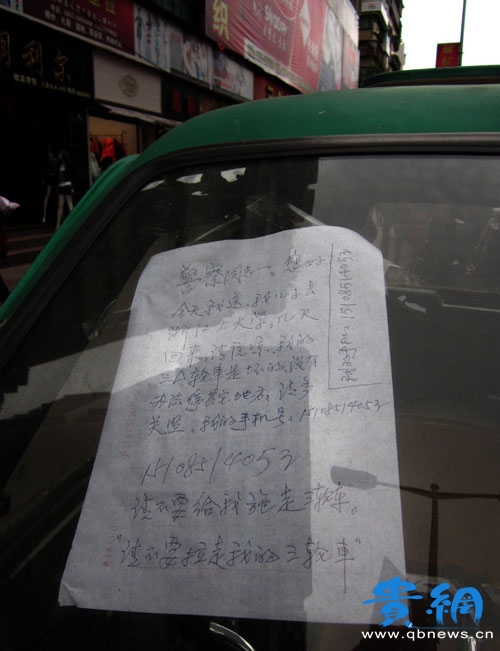 在紙條上,司機還寫了兩次“請不要拉走我的三輪車”,同時留下了電話。隨后,記者撥打了紙條上留下的電話。車主說,他是一個殘疾人,靠三輪車拉客賺錢,16號那天三輪車線路壞了,來不及修車,就把車子鎖在了垃圾箱上,“一回貴陽我就把車子移走。”