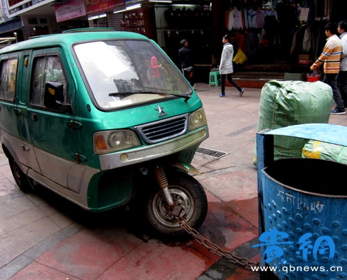 貴網9月23日訊(黔中早報 文/圖 記者 許澤斌 實習生 徐賜豪)昨天上午9點左右,李先生撥打早報熱線5858000:今天我去市西路步行街買東西的時候,看到一輛三輪車鎖在垃圾箱上,擋風玻璃上還貼了張請求警察不要拉走三輪車的紙條,真的太搞笑了,你們快來看看。