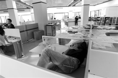溫州近9成家庭被指卷入高利貸,20多位老板跑路。9月26日,浙江溫州,討要材料款的供貨商躺在信泰集團辦公桌上。張宏偉 攝
