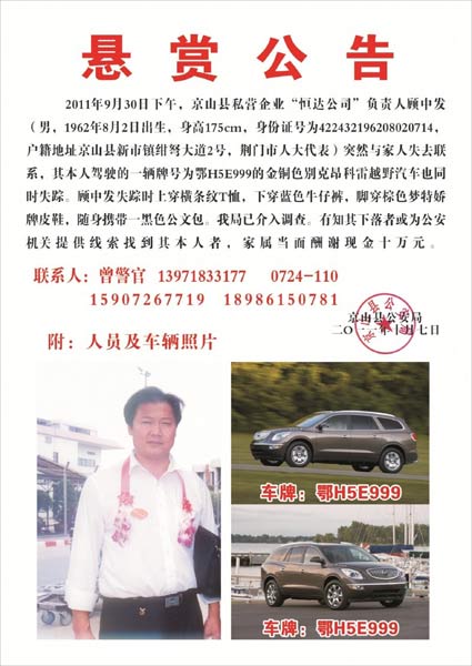 (湖北)京山縣私營企業京山恒達事業有限公司法人代表顧中發已經與家人失去聯系多日。家屬通過警方向社會懸賞10萬征集線索。