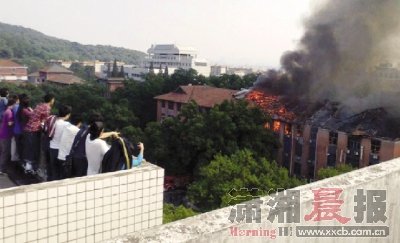 樓頂正在燃燒的中南大學化學化工學院理學樓,該樓已有51年歷史。