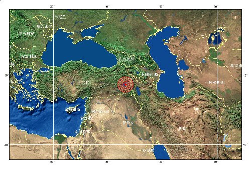 據中國地震臺網中心消息,北京時間2011年10月24日4時45分在土耳其(北緯38.6,東經43.2)發生6.0級地震, 震源深度10公里。
