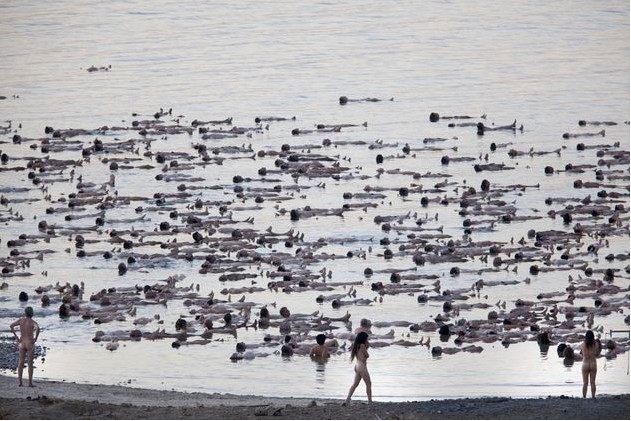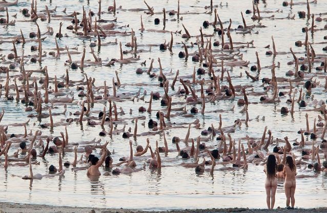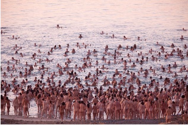 人民網10月27日訊 據英國《獨立報》報道,周六傍晚,美國藝術家Spencer Tunick完成了一個宏大的攝影項目,他邀請了1200位志愿者在死海邊拍攝裸體集體照。以色列旅游局官員希望這一攝影項目更夠幫助死海吸引更多旅游者。