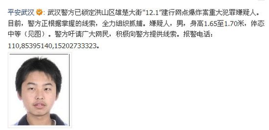 本報訊 (記者 李亦中 通訊員 潘峰)“12.1”洪山雄楚大街建行網點爆炸案重大犯罪嫌疑人浮出水面。昨日下午,武漢警方通過其官方微博“平安武漢”公布犯罪嫌疑人正面照,吁請廣大市民群眾積極提供線索,協助警方破案。