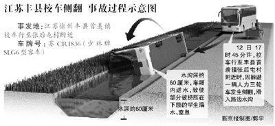 據(jù)公安交警部門(mén)現(xiàn)場(chǎng)勘查,該車(chē)躲避一輛人力三輪車(chē),側(cè)翻于路邊水深約60厘米的水溝內(nèi),車(chē)廂內(nèi)進(jìn)水,致使部分被擠壓在下層學(xué)生溺水、窒息。該車(chē)除進(jìn)溝側(cè)翻與路面刮擦泥土外無(wú)其他任何碰撞痕跡。