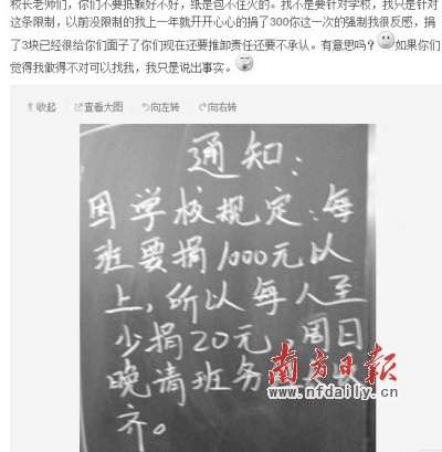 學生微博"被捐款"每班至少一千 校方要求刪除