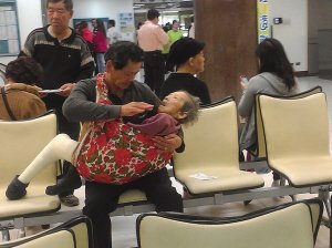 一方花布兜住一位瘦弱、頭發(fā)花白的老婦人,在肩膀處打個結(jié),中年男子一手托著老人,一手正要幫老人做什么。背景是醫(yī)院候診廳。