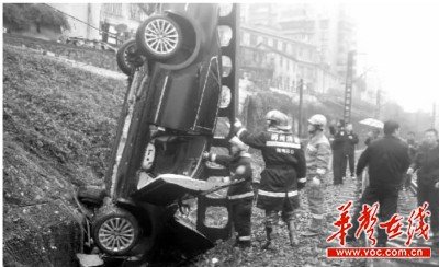 3月9日上午,郴州市人民東路蘇仙橋,一輛黑色小轎車沖出護欄墜入橋下鐵路路基上。