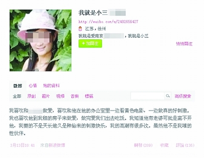 最新的一條微博發(fā)布時(shí)間為今年3月13日18點(diǎn)31分,其中詳細(xì)描述了自己與蘇某某同居生活的感受,內(nèi)容更加赤裸和低俗,不堪入目。該網(wǎng)友還在微博中貼出了多張照片。該網(wǎng)友在個(gè)人簡(jiǎn)介中直言不諱地表示:“我就是愛南京蘇某某,我就是小三”。記者注意到,系統(tǒng)顯示該網(wǎng)友注冊(cè)地點(diǎn)為江蘇省徐州市。