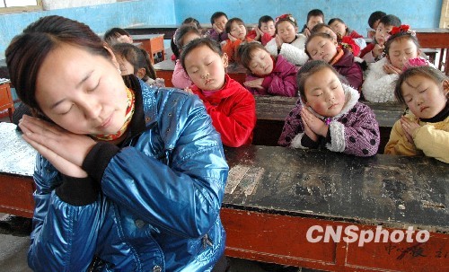 資料圖:2010年3月19日,河南省溫縣楊壘中心幼兒園的小朋友們在學“睡覺”。