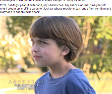 這名紐約男孩名叫約書亞(Joshua),患有一種名為嗜酸細胞食管炎(eosinophilic esophagitis)的罕見疾病,幾乎對所有食物都過敏,包括披薩、熱狗、花生醬以及三明治等。他的反應從嘔吐、腹瀉到過敏性休克等。即使聞到一些食物的味道,都可能令約書亞喪命。