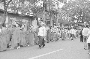 現代快報訊 十名“太監”領隊,舉著“回避”“肅靜”的牌子,“宮女”“丫鬟”們緊隨其后,押隊的“太監”還各配一把劍……昨天下午4時許,十全街烏鵲橋的路口上演了如此場面,上百號清裝打扮的年輕男女高調游街,讓市民們直呼“嚇死人”。