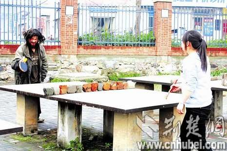 前日上午9點(diǎn),武漢外語(yǔ)外事職業(yè)學(xué)院商務(wù)英語(yǔ)專業(yè)的大一學(xué)生劉朝陽(yáng)和好友在學(xué)校大操場(chǎng)打乒乓球。熱戰(zhàn)正酣時(shí),她們發(fā)現(xiàn)經(jīng)常在學(xué)校溜達(dá)的拾荒者“流浪哥”坐在一旁“觀戰(zhàn)”。劉朝陽(yáng)上前邀請(qǐng)“流浪哥”來(lái)一起玩。“流浪哥”欣然拿起球拍,與小劉對(duì)打起來(lái)。劉朝陽(yáng)告訴記者,“‘流浪哥’球技還不賴,雖然他說(shuō)的話不多,但能感覺(jué)到他很開心。”放下球拍已接近10點(diǎn),得知“流浪哥”沒(méi)有吃早餐,小劉又請(qǐng)他到附近的早點(diǎn)攤吃米粉,并叮囑“要加一個(gè)雞蛋”。
